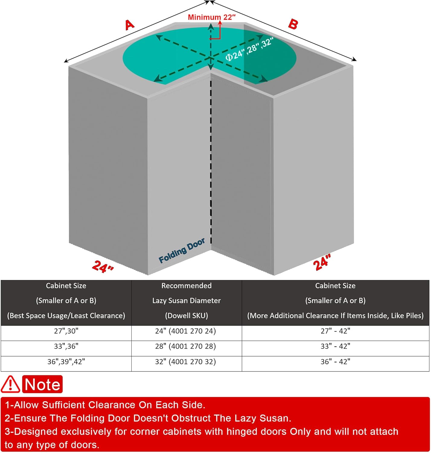 - DESIGNED FOR BASE CORNER CABINETS: Each shelf is kidney shaped (also called pie shaped or 270 degrees) in order to fit easily inside a base corner kitchen cabinet with a hinged diagonal door. The actual diameter of the lazy susan is 28" so the ideal cabinet size is 33" with an internal clearance of 36". No part of the lazy susan will attach to the door. Final assembly must be completed inside the cabinet to ensure fit.