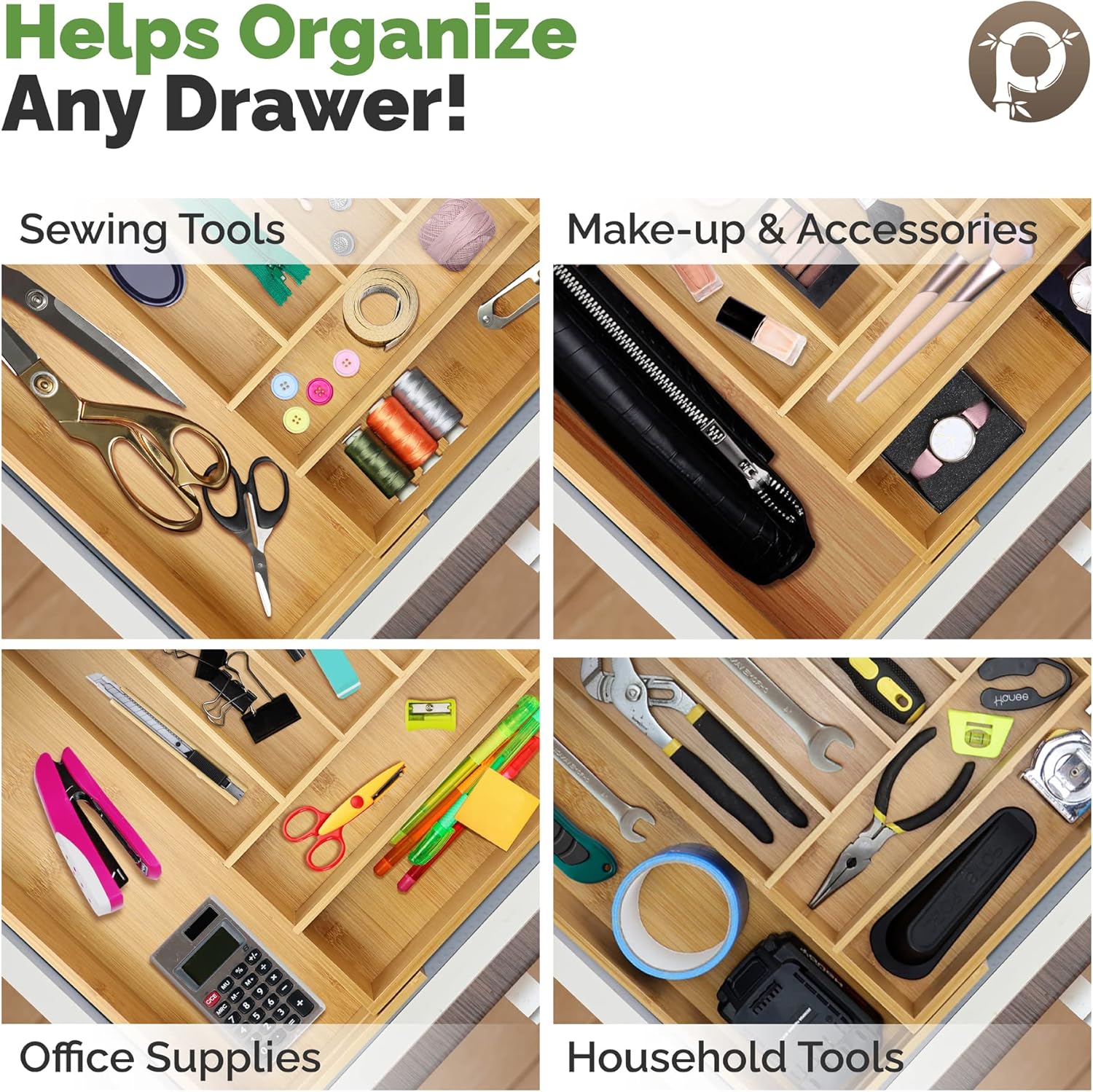 - ADJUSTABLE WIDTH & LOCKING MECHANISM: Innovative expandable sides lock in place when fully expanded, so you can choose between 6, 7, or 8 compartments to accommodate your desk supplies or various kitchen utensils of different sizes. Much better than ordinary bamboo drawer dividers. Expands from 12.5 inches to 19.3 inches. (Please measure your drawer carefully before ordering to avoid disappointment.)