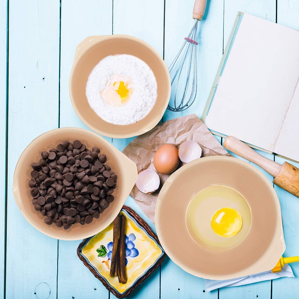 - NON-SLIP & NON-STICKY – Base is designed with a silicone bottom to keep each bowl from skidding or slipping during mixing. Ingredients won’t stick to the non-stick plastic surface, making lengthy mixing less tiring.