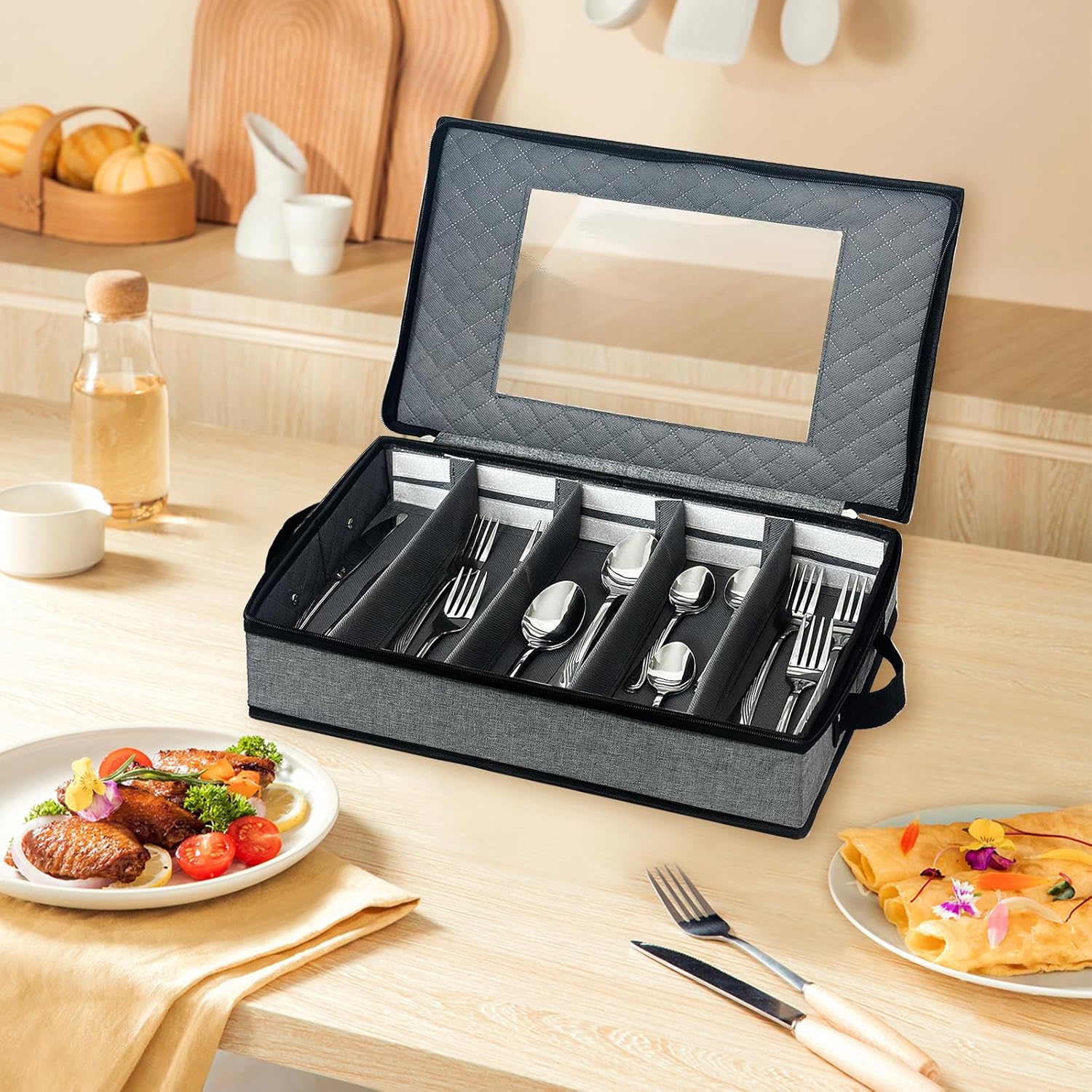 - đȘăLarge capacity flatware storageă: Our silverware storage box is 16.5" W X 11.4" D X 3.15" H. It features 5 customizable compartments and 4 removable padded dividers for storage and protection. The utensil storage can hold up to 12 pieces in each compartment.