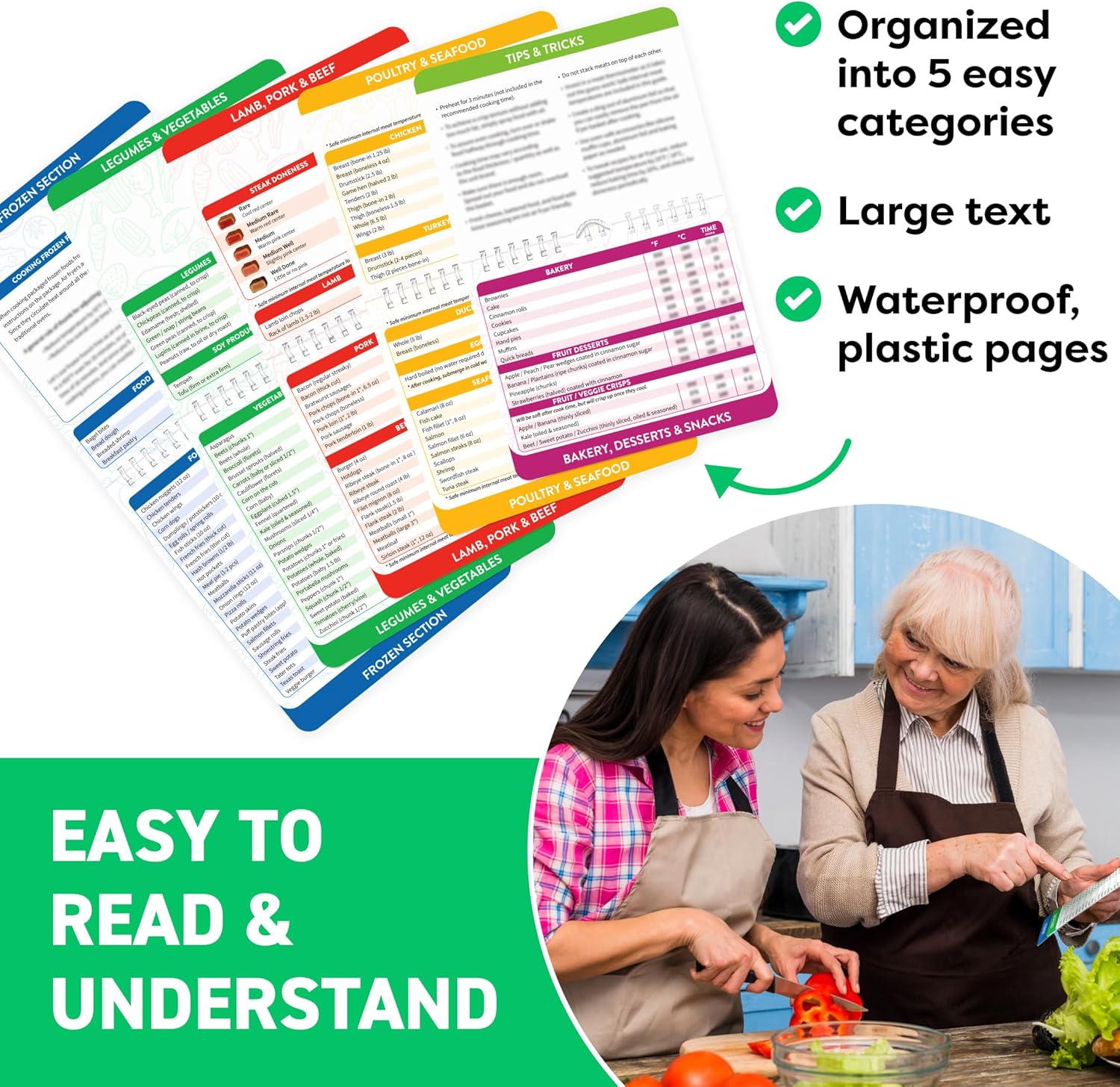 - Premium, Waterproof, and Easy To Clean. Our air fryer cooking guide flip chart is built with tear-proof plastic and measures 7" x 6". Magnetically attach it to your fridge for quick access or hang it using the built-in hook. Must have air fryer accessories that combine function and durability with easy-to-navigate design - essential kitchen gadget for beginners and pros alike.