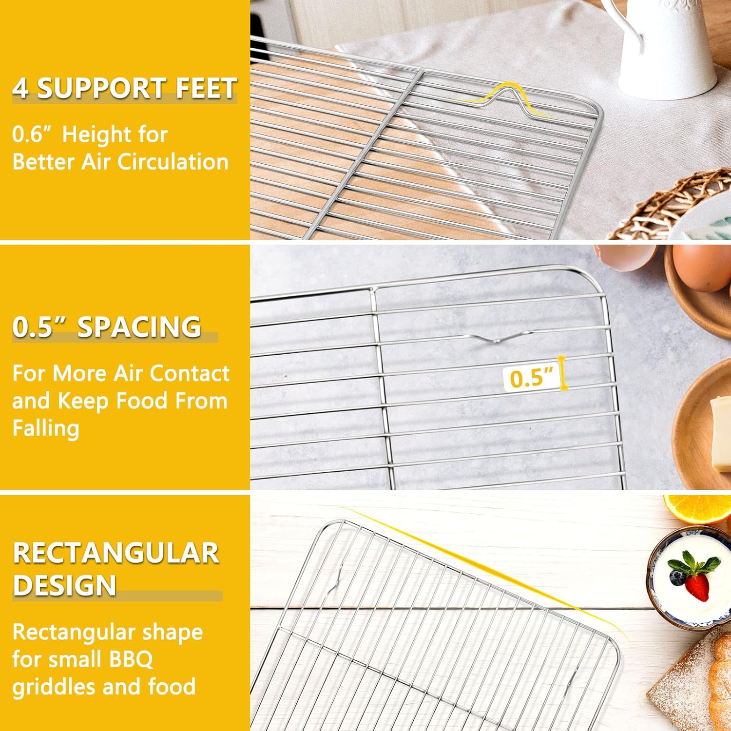 - Craft Design, the recessed design on the top of rectangular griddle dome is for more stable usageand better circulation of air flow inside. The cooling rack for cooking designed with 4 bracket feet, make the entire grill rack to be raised by 0.6", and 0.5" grid spacing maximizes contact with air and prevents your treats from falling through