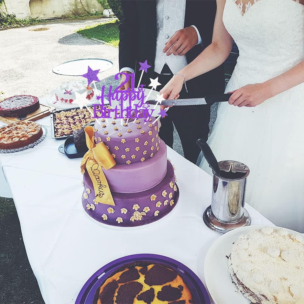 Glittery 21st Happy Birthday Cake Topper with Star,Personalised 21 Birthday Cake Toppers Party Decorations Party Supplies for Boys Girls Purple Silver