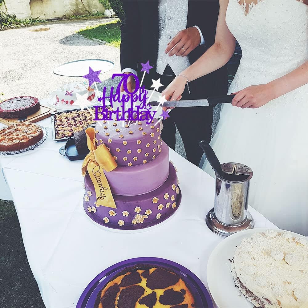 Glittery 70th Happy Birthday Cake Topper with Star,Personalised 70 Birthday Cake Toppers Party Decorations Party Supplies for Men Women Purple Silver