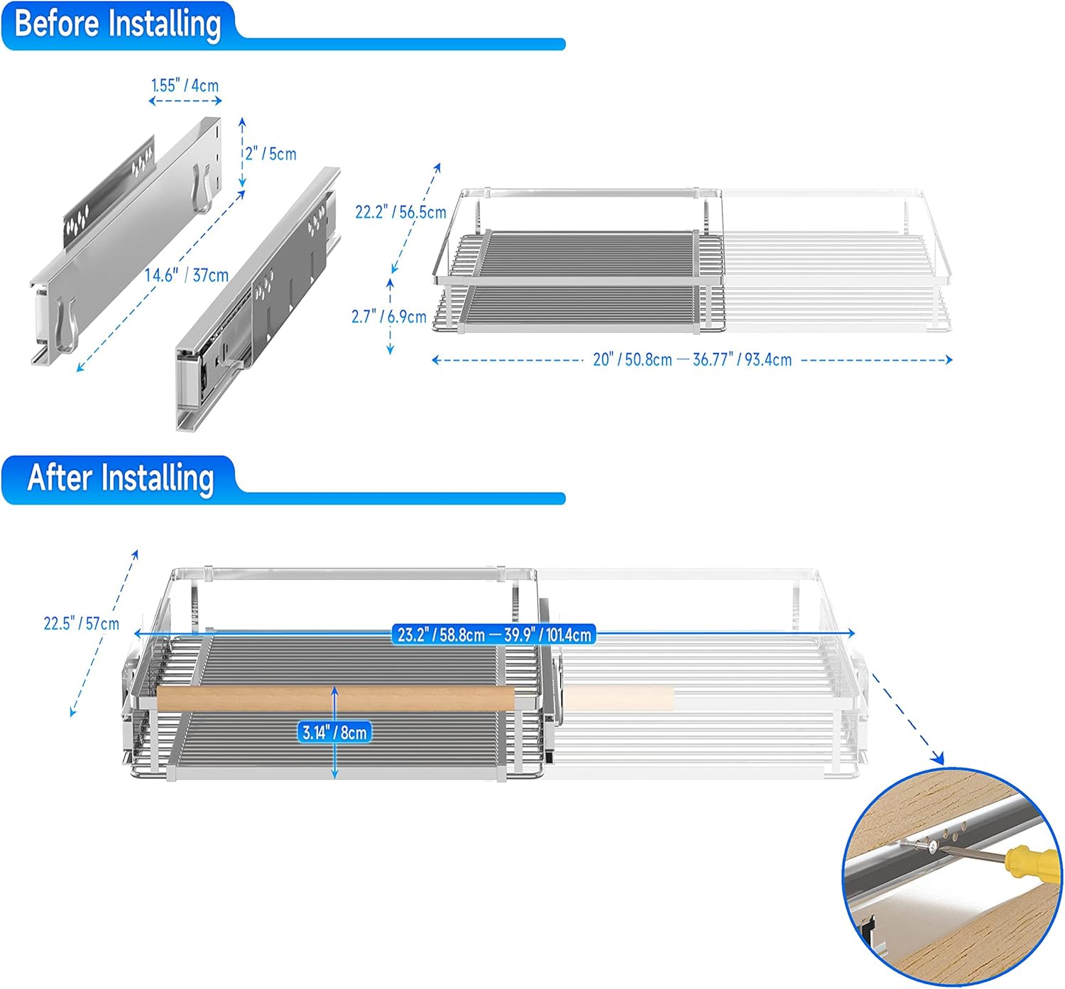 - Pull Out Drawers for Kitchen Cabinets with Adjustable Height: The improved slide out cabinet organizer is more flexible than the traditional pull out cabinet organizer. Its guide rail is installed on the side of the cabinet rather than the bottom of the cabinet. So it can be installed at any height. You can adjust the height of the installation basket according to your comfort. Note: Avoid the hinge of the cabinet during installation