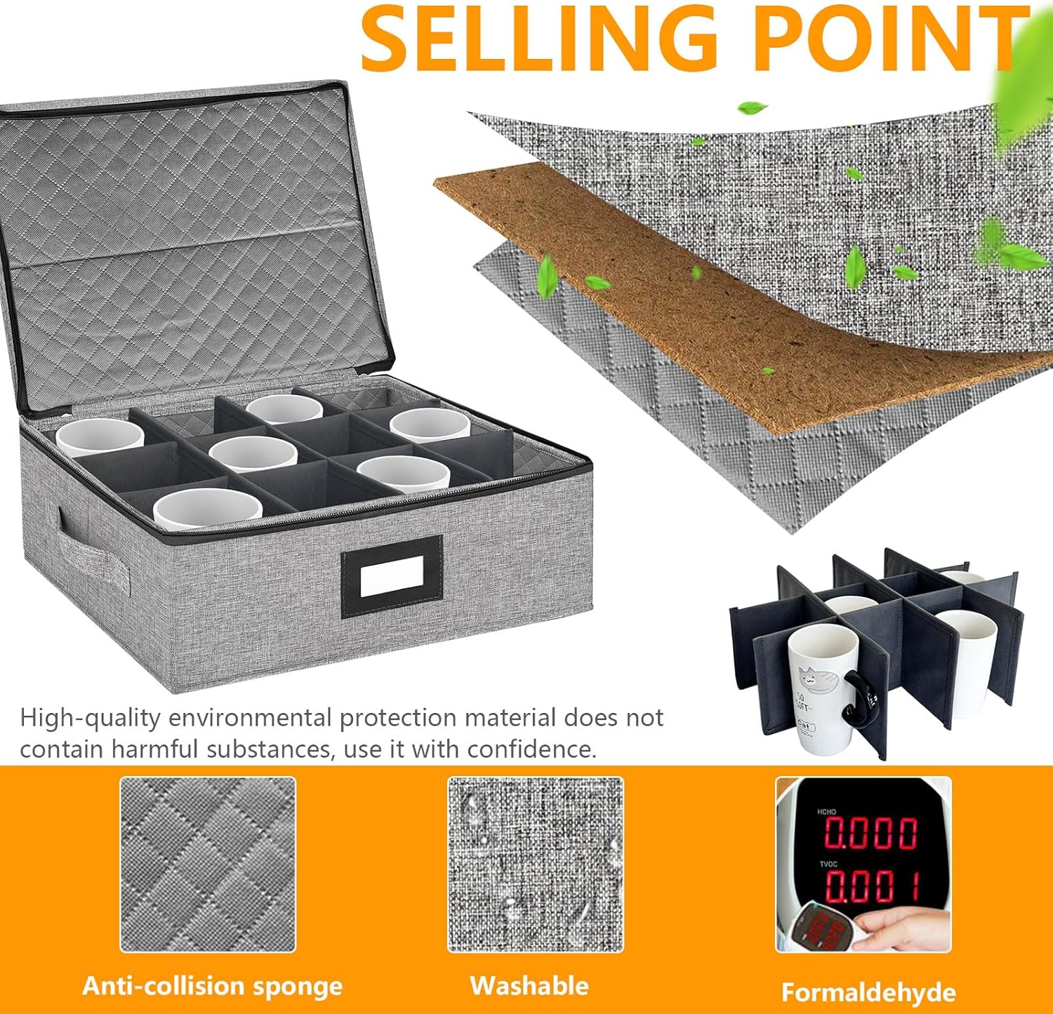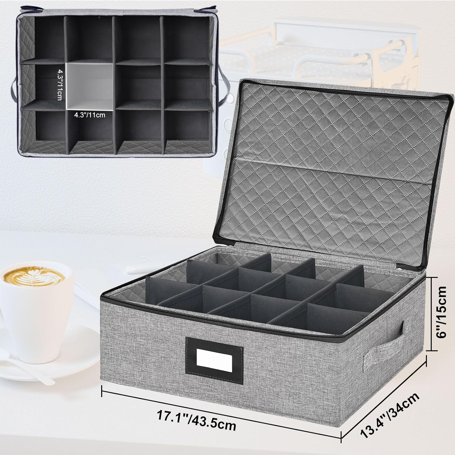 Coffee Mug Storage Box with Dividers, China Storage Containers Hard Shell ,Glassware Storage Containers with Zipper Lid and Handles, Stackable for 12 Mugs, Tea Cups, Moving & Packing (Light Grey)