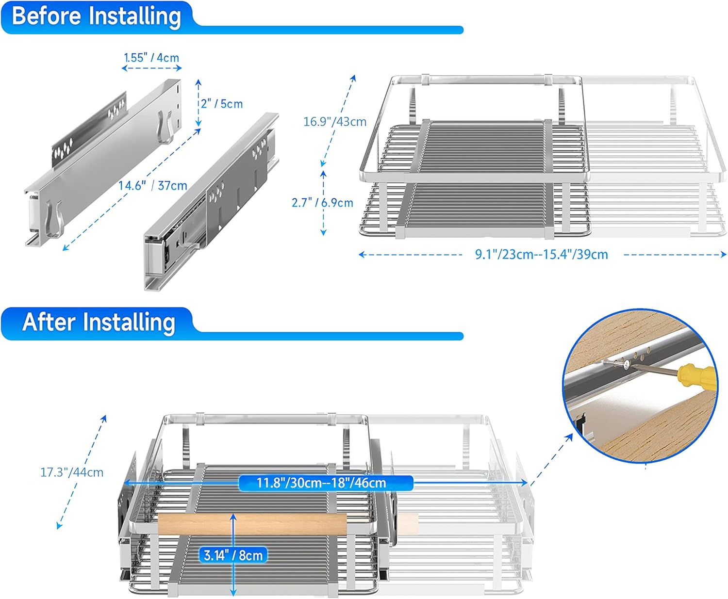 - High Quality Material: The pull out drawers for kitchen cabinets is made of stainless steel, which can directly contact tableware and food, and is very safe, waterproof and rust proof. Stainless steel metal pull out drawers for kitchen cabinets is more durable and more supportive than ABS plastic basket. Simple and low-key colors can match with cabinets of various styles, suitable for a variety of family styles.