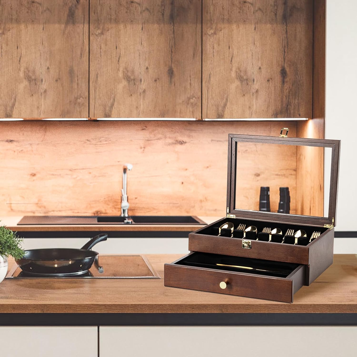 Silverware Box, 2-Layer Wooden Silverware Storage Box with Glass Lid, 14.5×10.6 Inches Luxury Style Decor Flatware Storage Case for Fine Flatware & Utensils, Gift Idea (Walnut)