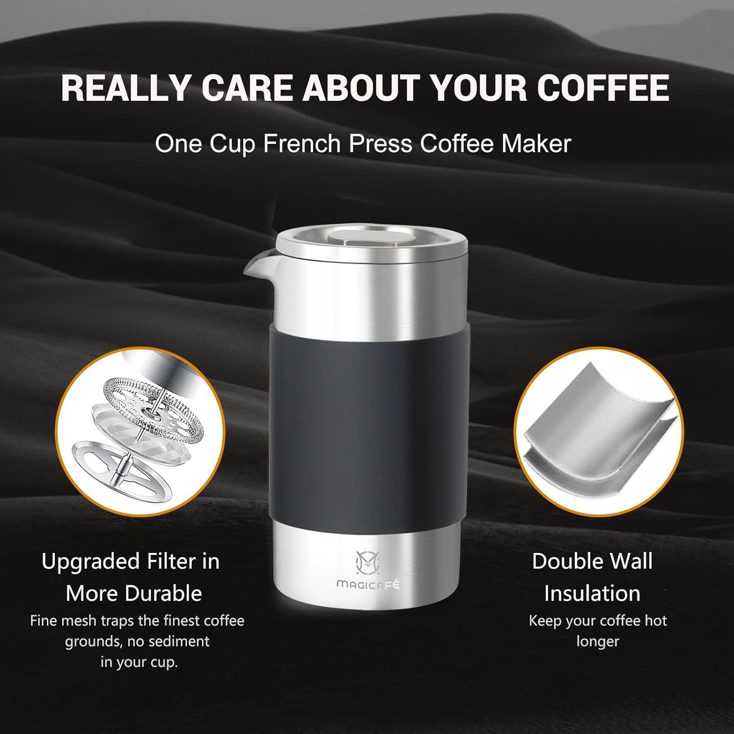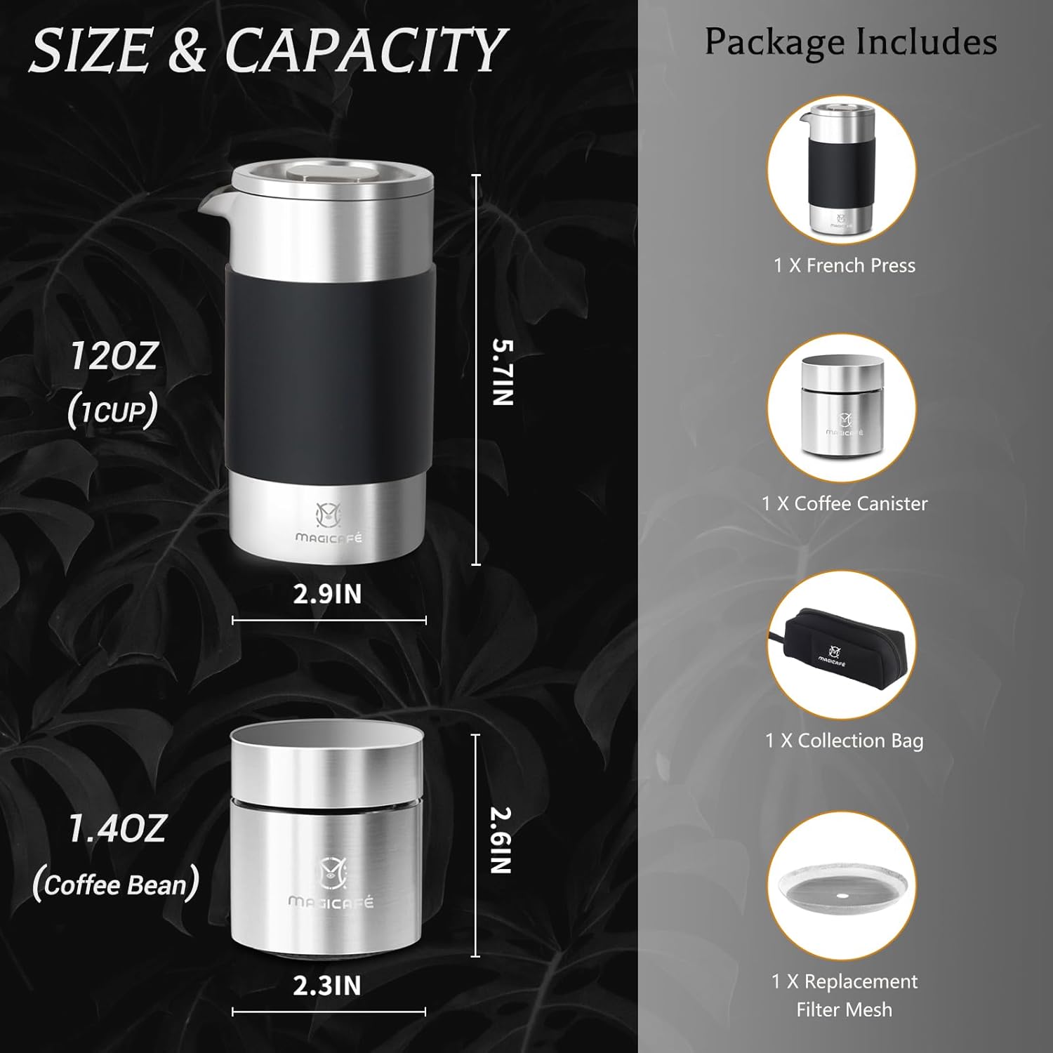 - 1.ENJOY YOUR FRESH COFFEE ANYTIME ANYWHERE - MAGICAFÉ french press comes with a coffee grounds canister and a collection bag. Perfect for those who love coffee and are always on the go. This coffee press is designed to be compact and easy to carry around, allowing you to enjoy a freshly brewed cup of coffee wherever you are. 12oz/350ml capacity perfect for 1 cup coffee. Great for daily use, backpacking, camping, traveling and using in your office.