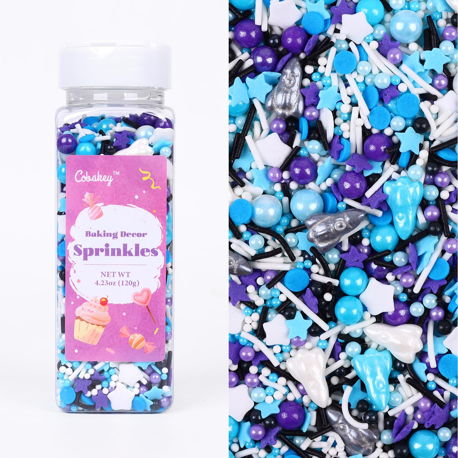 - Customer Service: Cobakey Store has been committed to creating a distinctive cake decorating style, we hope our sprinkles can bring sweetness to your life. ATTENTION: The Bigger The Sugar, The Harder It is. It is Recommended to Eat Small Sugar, Or Melt It in Your Mouth Rather Than Bite It.