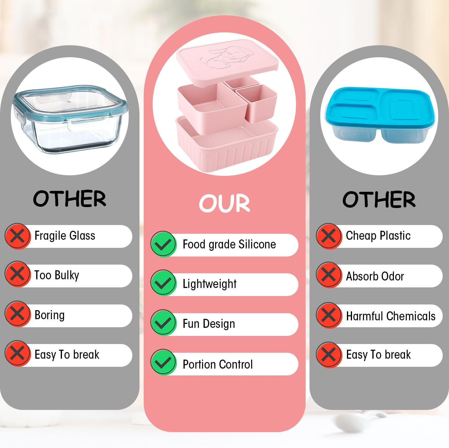 - 【Say Goodbye to Mess】The silicone bento box lunchbox for Kids has individual compartment to keep food neat and separate. The leak proof silicone lids seal tightly around the lip of the container and ensure that the box remains tightly sealed during transport, preventing any spills or accidents. Easy to open and close for little fingers. Meanwhile,anti-slip design make the silicone bento box more safe