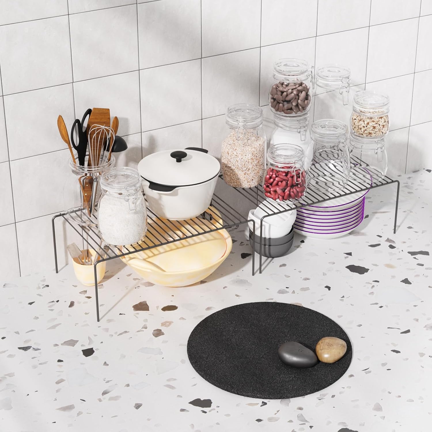 - Perfect Size: Each wire shelf measures 15.7''L x 9.4''W x 5.9''H. Perfect size makes this cabinet shelf rack perfect for you to organize your kitchen supplies, you can easily organize your jars, pots, pans and spices etc