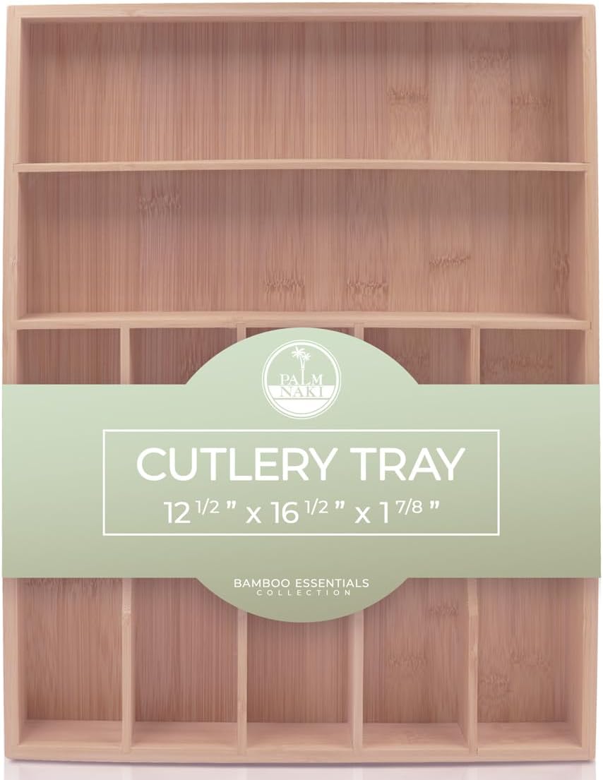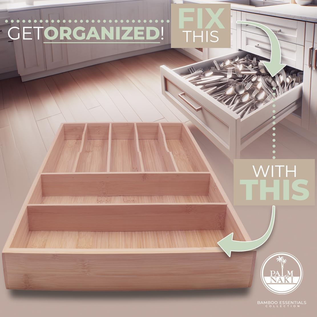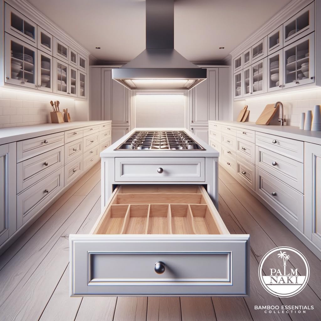 - 🌿 Transform Your Space with Elegance and Efficiency - Discover the ultimate solution to declutter your drawers and beautify your home with Palm Naki's premium bamboo cutlery tray. Designed with precision, our organizer features expansive compartments tailored to fit drawers of any size, ensuring a custom fit that brings harmony and accessibility to your kitchen, office, or vanity.