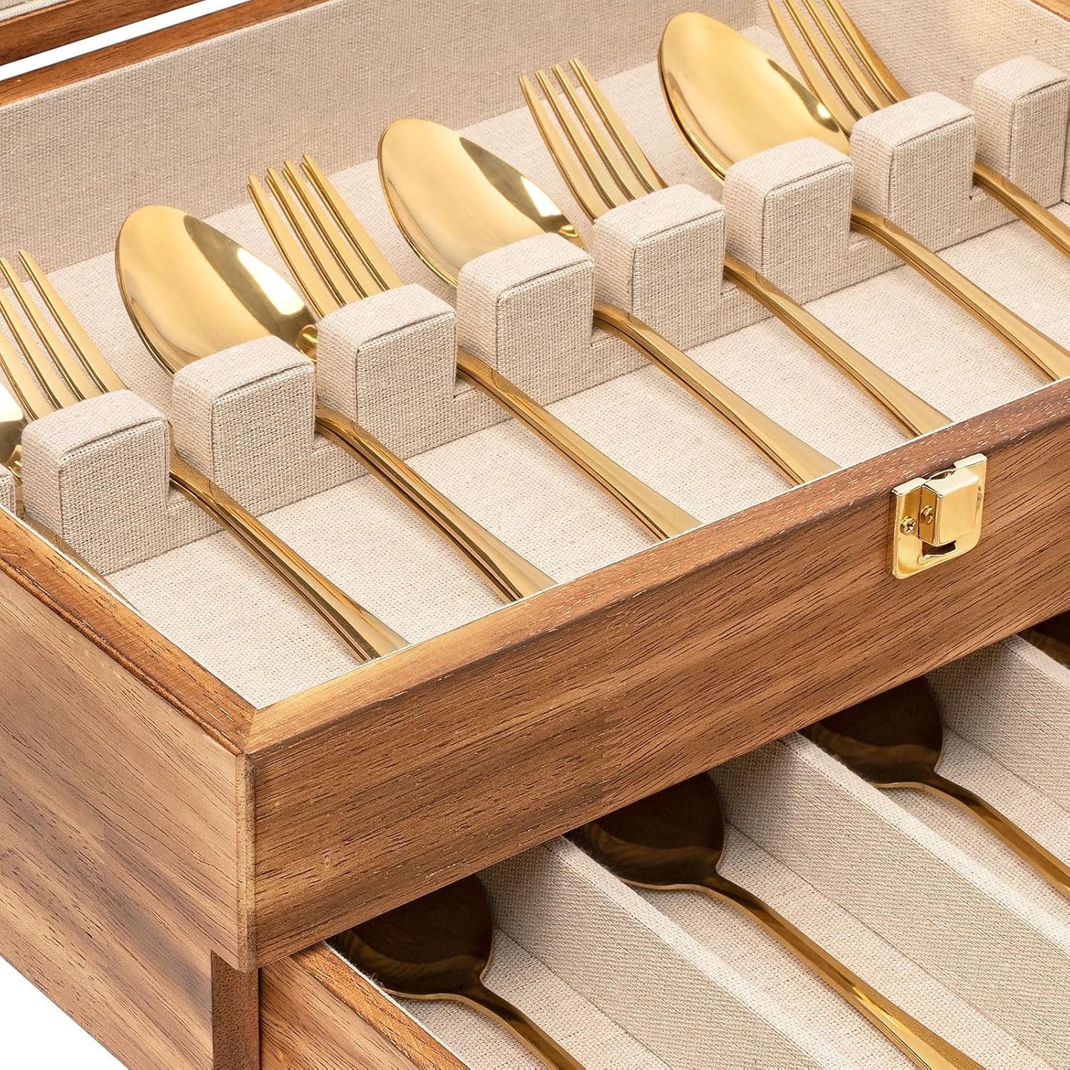 - Authentic Wood Craftsmanship: Crafted from solid wood in a rustic country style, this sturdy and durable silverware chest exudes a sense of luxury. The silverware boxes for flatware features the linen lining to effectively prevent scratching or damage to your silverware, ensuring they're intact for years to come.