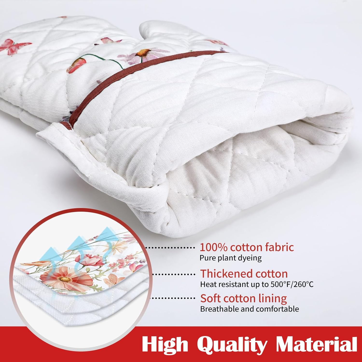 - PREFERRED MATERIAL: Each pot holders & oven mitts set is carefully crafted from 100% cotton, with dyes sourced from plants, digital printing technology and upgraded color fixing process, the colors are bright and fade-resistant. Cotton lining to bring you comfortable and breathable touch and protect your skin as well.
