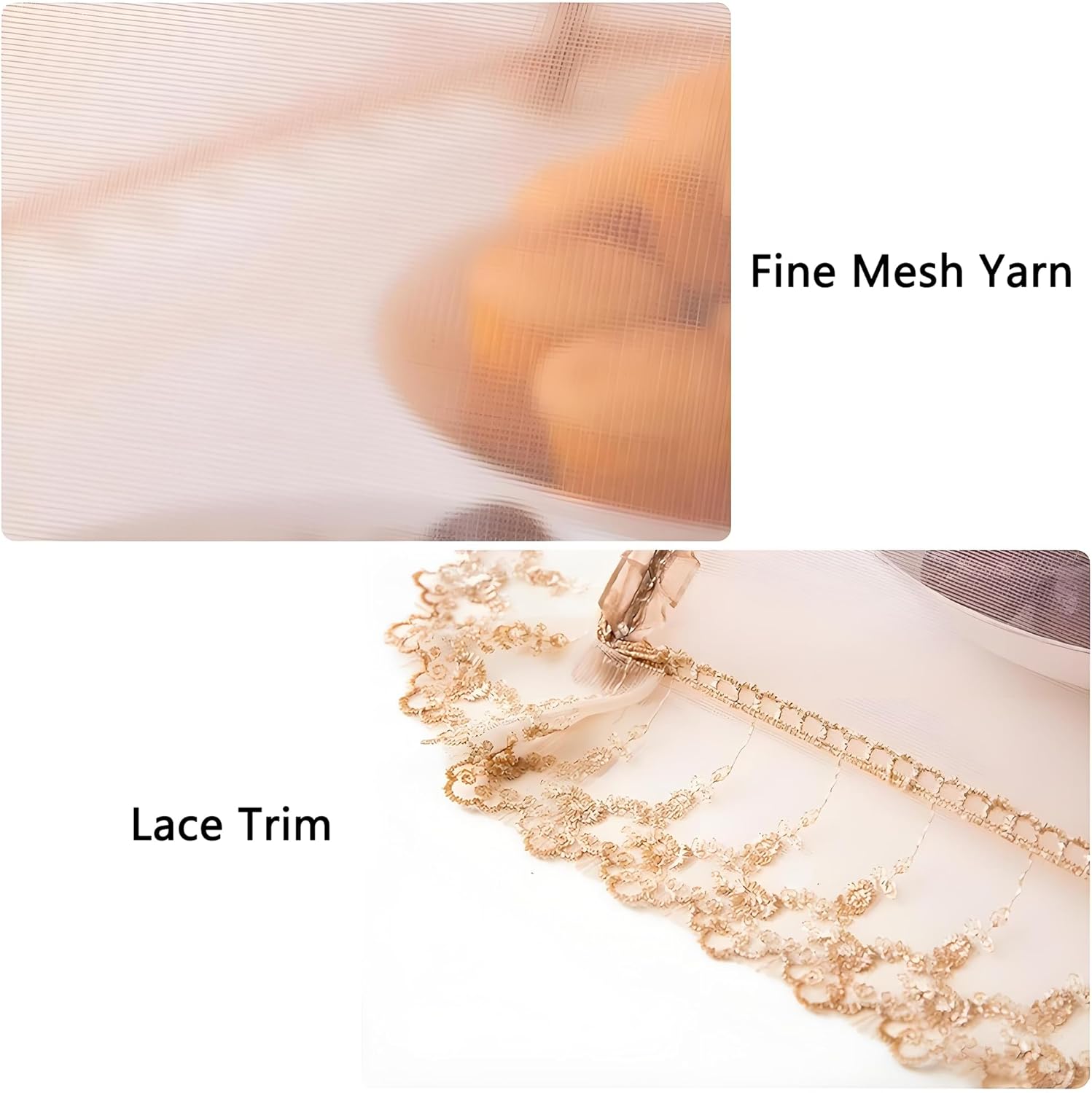 - 2.Food screens for outside reduce stress and improve al-fresco dining. Bottom of collapsible food covers are finished with moderate lace edging acting as a barrier, an effective net for food. Re-usable outside food covers protect platters of food better than tinfoil, paper towels or paper plates with zero waste. Include the food pop up tent in all your party supplies.