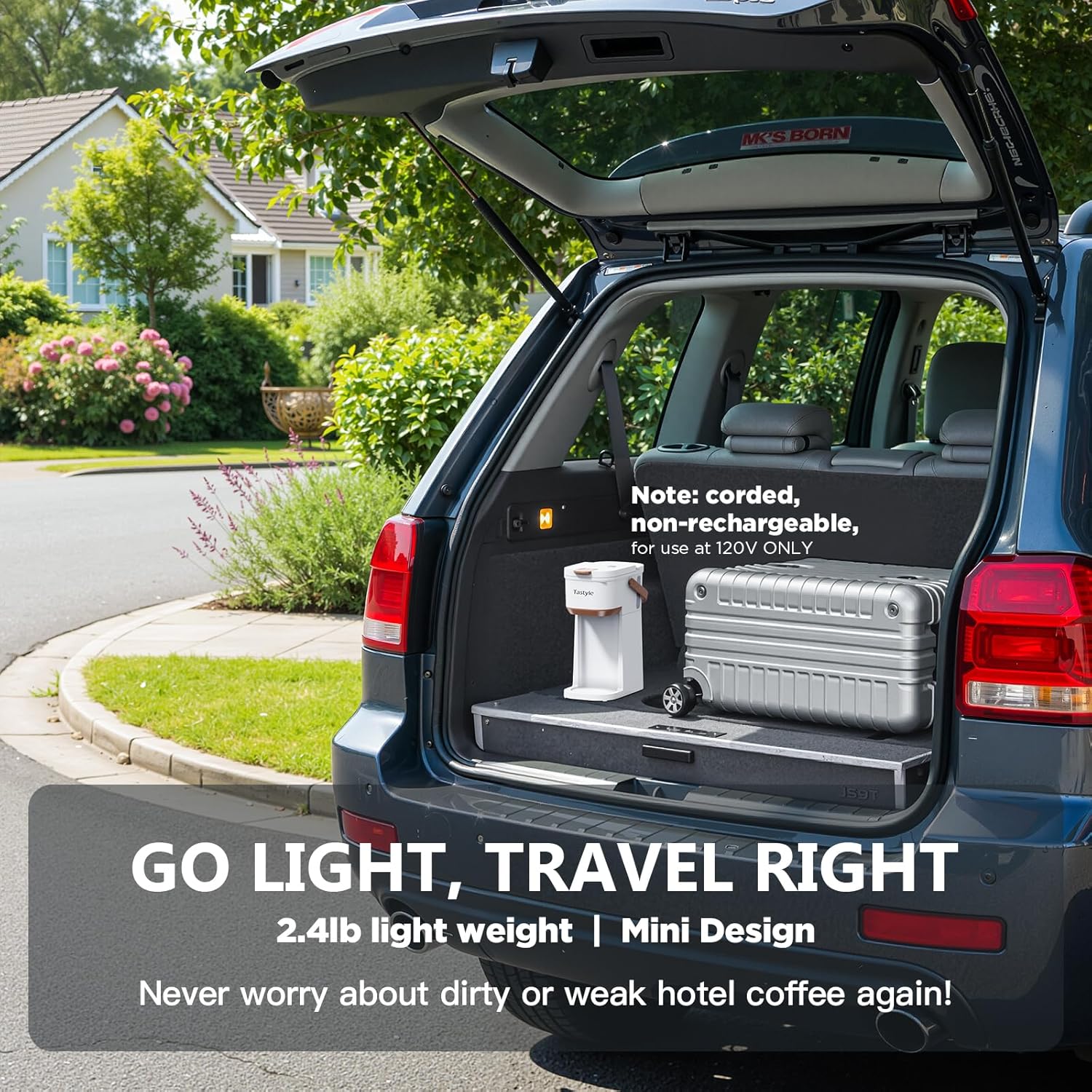 - Litte Coffee Maker with To-Go Handle: This single cup coffee maker has a very small footprint (8.1''D x 4.6''W x 9.8'' H) and a portable handle, making it a breeze to take on the go for travel, camping, or anywhere else you desire. It fits perfectly in small spaces like offices, RVs, dorm rooms, apartments, and hotels