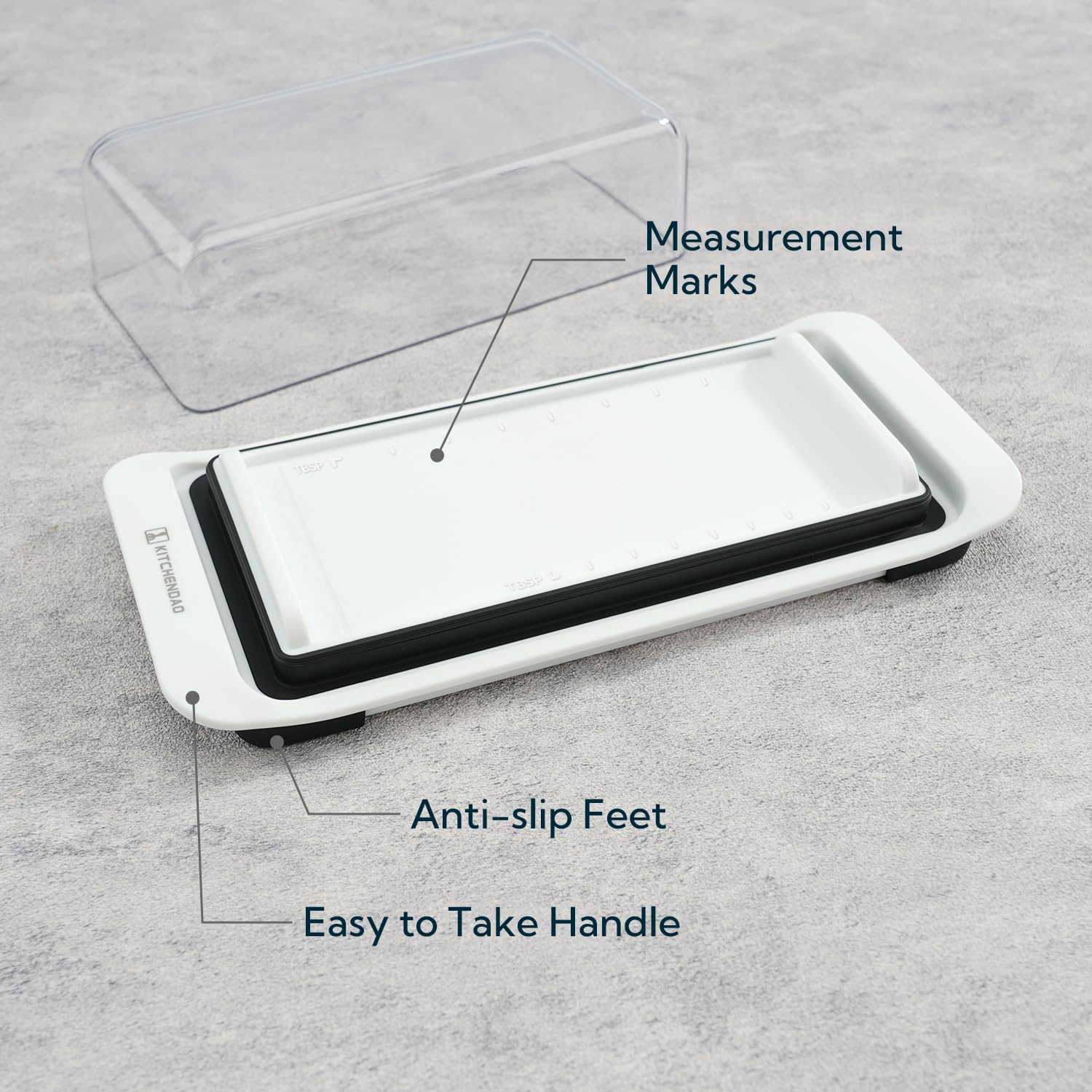 - Measurement Marks & Anti-slip Bottom: Has TBSP marks and slight recess for the butter to stay in place. The scale lines on the butter tray can help you control the calorie intake and measure the butter you need. Anti-slip bottom makes the plastic butter holder more stable and stay in place when cut the butter