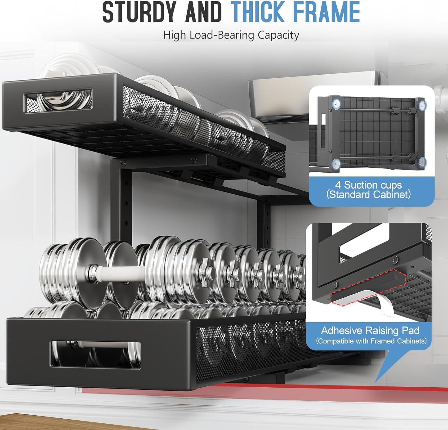 - ă2-Tier Pull-Out Design for Easy AccessăThis under-sink organizer features a double-layer pull-out design, allowing you to easily access items at the deepest part. The upgraded, thickened iron circular sliding rails ensure a smooth and seamless pulling experience, making each use effortless. The unique pull-out locking mechanism effectively prevents the drawers from being completely pulled out, avoiding the risk of items falling or structural damage caused by over-pulling, ensuring safer and more convenient use.
