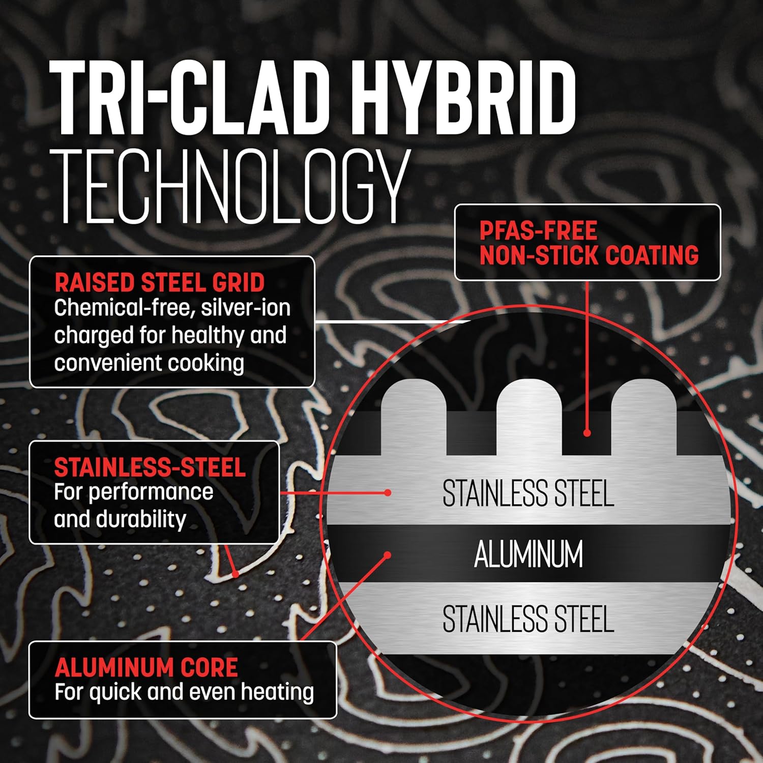 - PFAS-FREE NONSTICK: Hell’s Kitchen Tri-Clad Hybrid cookware contains a diamond reinforced non toxic ceramic coating, free from forever chemicals, silver-ion charged for healthy cooking.
