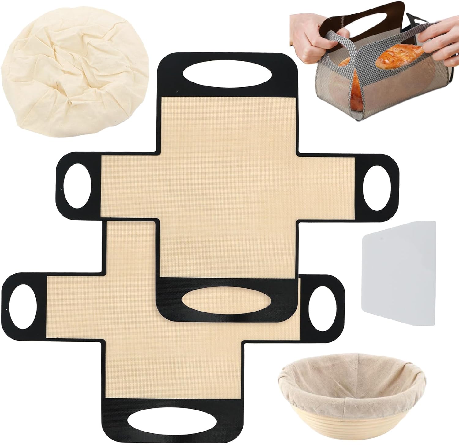 - Reusable: This silicone sling for sourdough bread is the best alternative to traditional disposable baking mats, which can be reused, providing you with a sustainable choice. You will receive 2 bread pan liners with 1 scraper and 1 bread proofing blue cloth cover with the size of 7.9*3.1 inches.