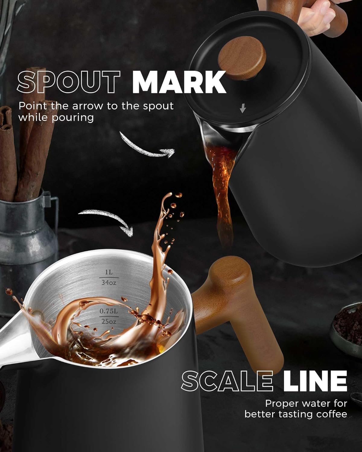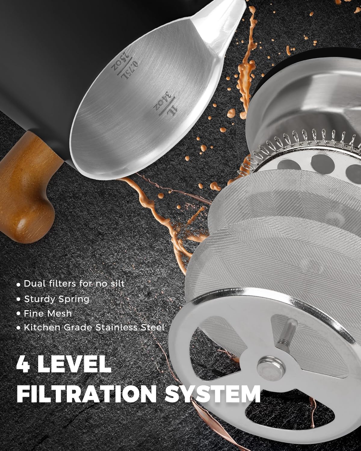 POLIVIAR French Press Coffee Maker, 34 oz Coffee Press with Real Wood Handle, Double Wall Insulation & Dual-Filter Screen, Food Grade Stainless Steel for Good Coffe and Tea, JX2025-XFPB