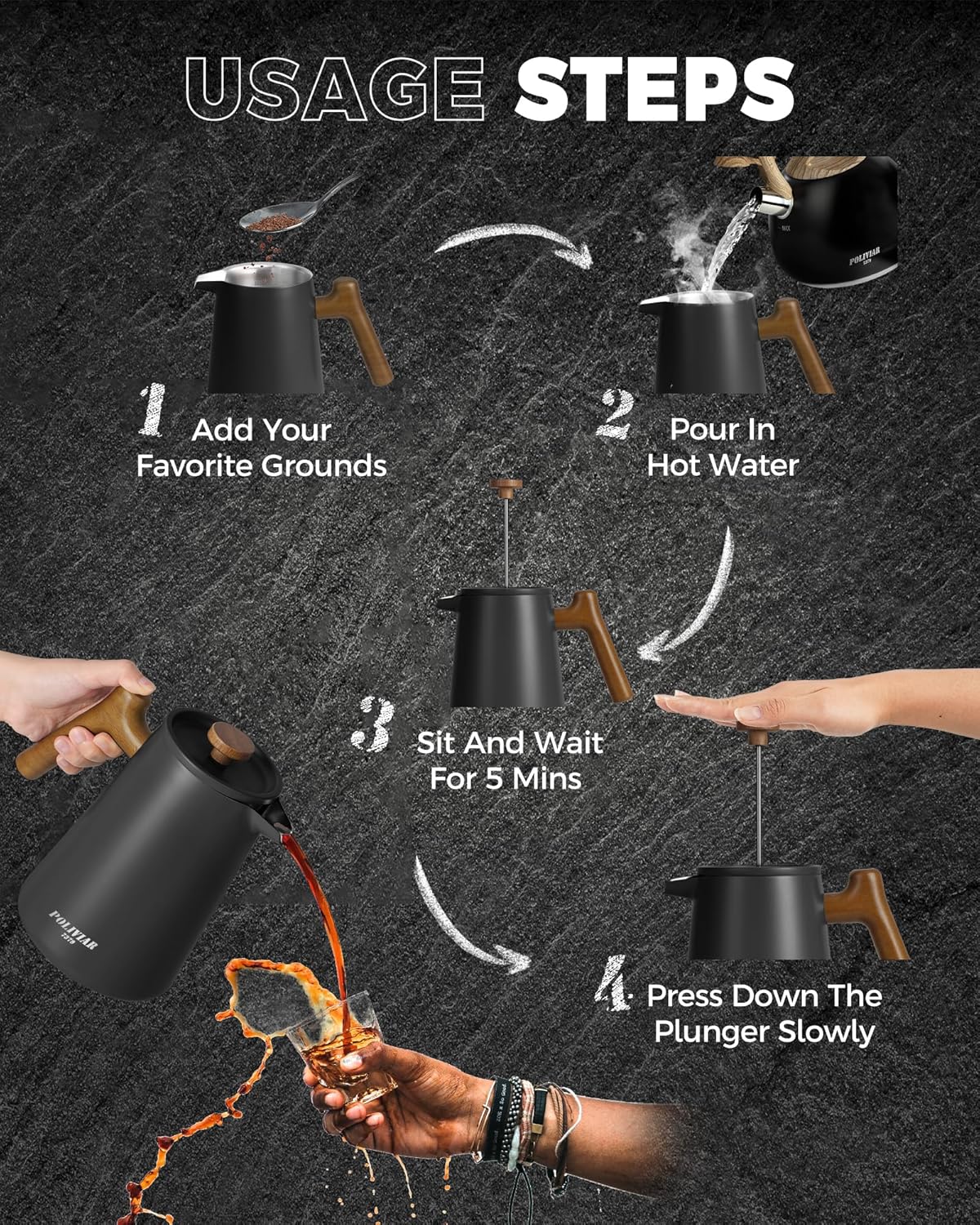 - LOOKING FOR COFFEE PRESS FOR MATCHING UP YOUR KITCHEN? We, the POLIVIAR french press coffee maker will be your smart choice. While the coffee pot is made from food grade stainless steel with stylish long-lasting coating, It is easily to match up your kitchenwares and your kitchen's theme. Also, the ergonomic handle with real wood will maximize the fantastic time of grounds you loved.