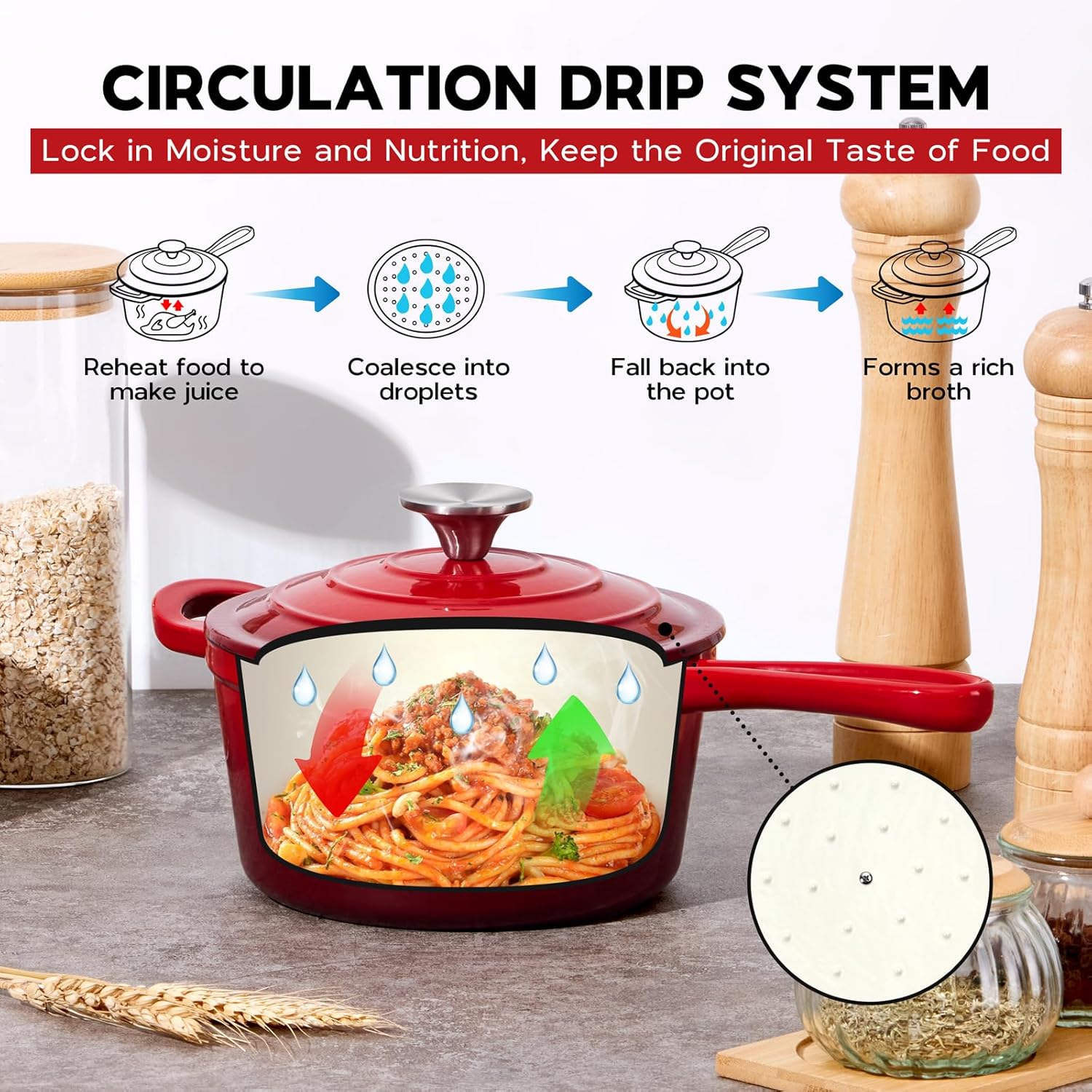 - Self Basting Lid: the raised dots underneath the lid collect condensed steam or broth and redirect it back onto the food, preserve the natural flavors and make food juicy, no seasoning required
