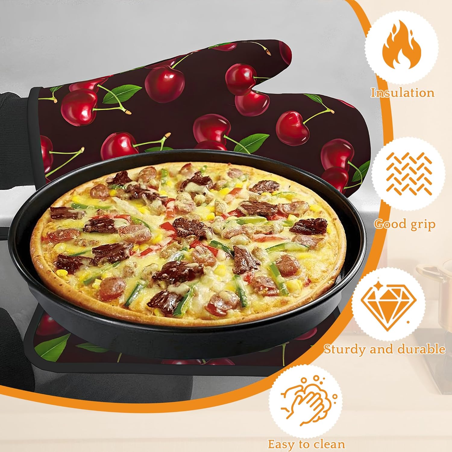 Cherry Oven Mitts and Pot Holders Set,Red Kitchen Decor Heat Resistant Non Slip Hot Pads and Oven Mitt for Chef Cooking Baking BBQ Mom Girl Gifts(4 Piece Set)